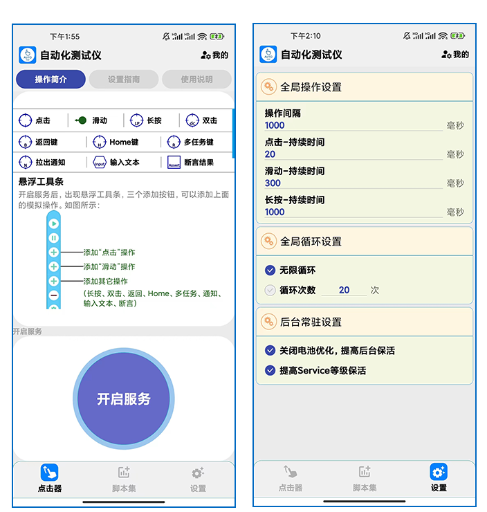 添加模拟操作后,可以单独为其设置,比如可以为点击操作设置“点击-持续时间”设置为20毫秒,点击时长为10毫秒,比较快的点了一下。比如为滑动设置“滑动-持续时间”设置为300毫秒,滑动时长为300毫秒,比较快速的滑动