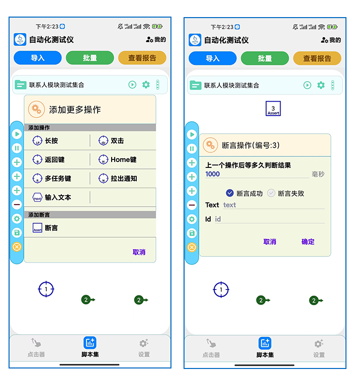 可见“断言成功”是界面出现Text元素说明成功,而“断言失败”是界面没有Text元素说明成功,“断言失败”一般用于删除等操作后的结果判断,比如测试删除“张三”联系人时,勾选“断言失败”来断言列表没有“张三”联系人说明删除成功。
