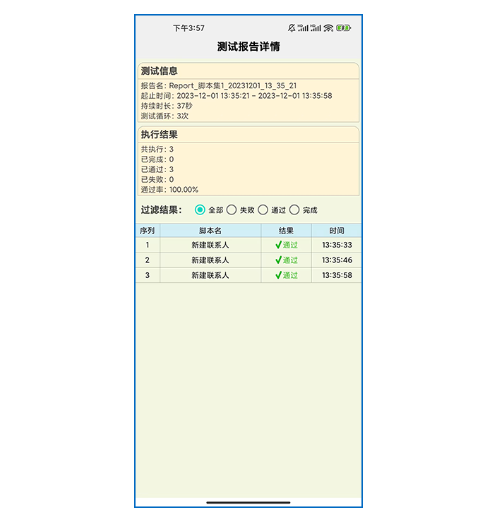 自动化测试报告生成。可以体现测试起止时间,持续时长,循环执行次数,测试通过或失败的结果。